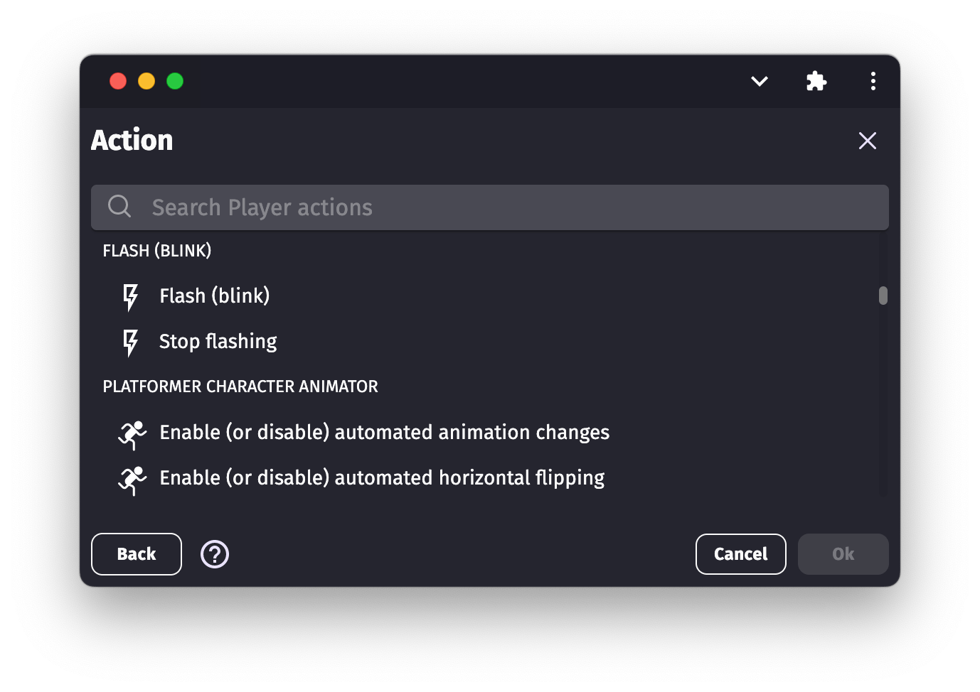 - Even if no behavior is provided, you'll have some actions or conditions. Find them in the list of actions or conditions when editing an event. The name of the category containing them is the same as the extension.