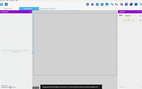 Scenes contain objects displayed on screen as game content. Each object you place on a scene is called an instance. Your breakout game will have several instances of the brick object on a game level scene. Scenes also contain events - actions that happen under specific conditions - to animate the scene.
