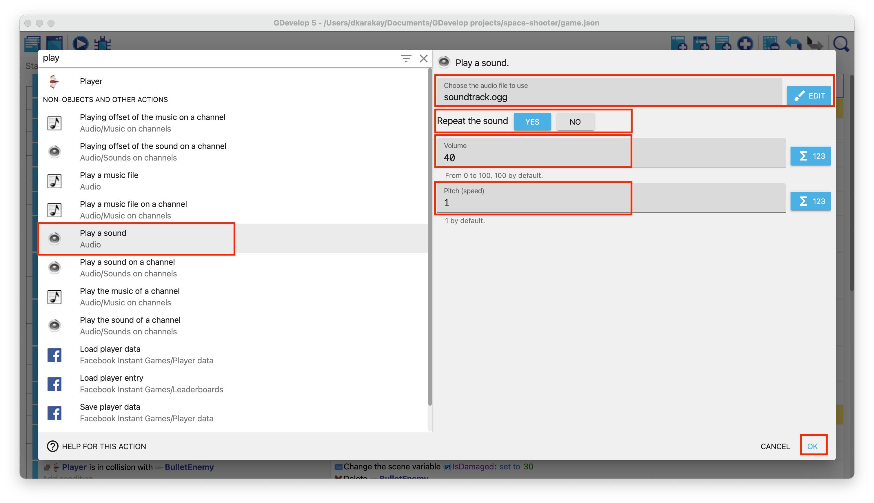 Create a new action in the previous event. Type play on the search bar, and select Play sound. Add an audio file called "soundtrack.ogg" from the assets folder. Set the volume 40, and enter 1 as the pitch value.